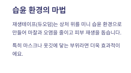 재생테이프는 상처 위를 “미니 습윤 환경”으로 만들어서 마찰·오염을 줄이고 피부 재생을 돕는 데 목적이 있습니다. 특히 상처가 잘 마르거나, 마스크·옷깃에 닿는 부위라면 도움이 되는 경우가 많아요.