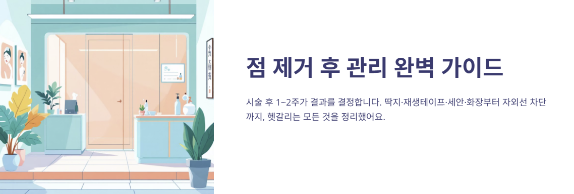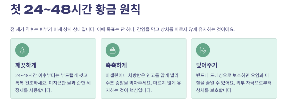 점 뺀 후 관리는 촉촉하게 보호하고, 딱지는 건드리지 말고, 자외선 차단만 꾸준히 하면 결과가 훨씬 깔끔해집니다.