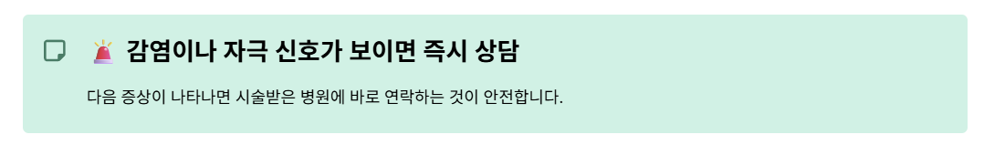 통증이 점점 심해짐, 고름/심한 붓기, 열감, 지속적인 출혈, 붉은기 확산, 알레르기(발진) 의심 등 “감염/자극” 신호가 보이면 시술 병원에 바로 상담하는 것이 안전합니다.