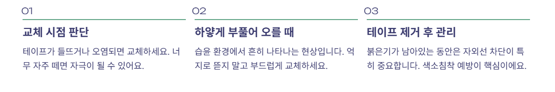 - 교체 시점: 들뜨거나 오염되면 교체하세요. (너무 자주 떼면 자극이 될 수 있어요)